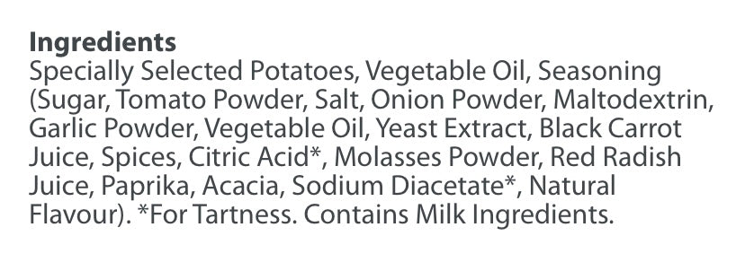 特選馬鈴薯、植物油、調味料(糖、番茄粉、鹽、洋蔥粉、麥芽糊精、大蒜粉、植物油、酵母提取物、黑胡蘿蔔汁、香料、檸檬酸*、糖蜜粉、紅蘿蔔汁、辣椒粉、阿拉伯膠、醋酸二鈉*、天然香料)。*用於增加酸味。含有牛奶成分。